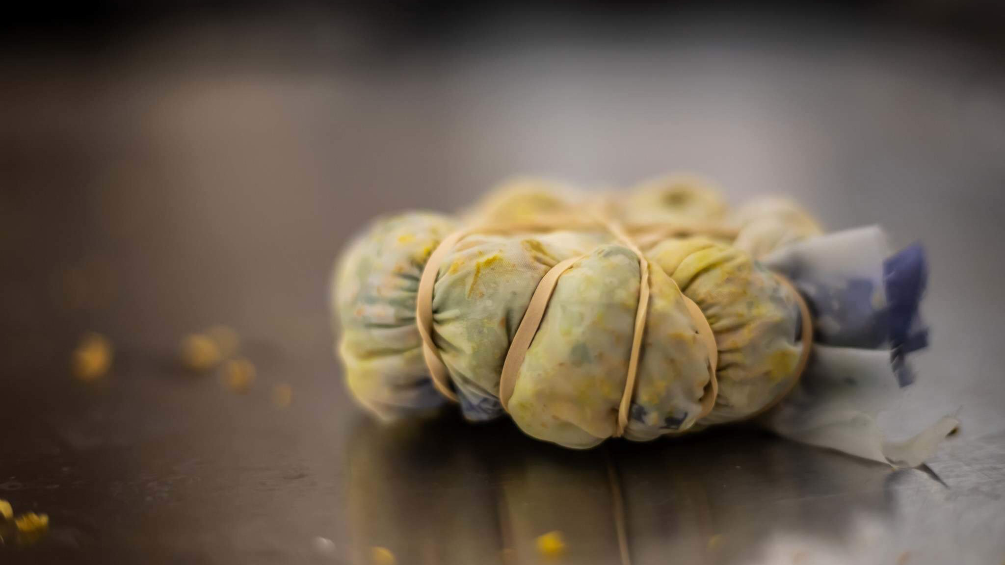 The outer self fabric is linen dyed with walnut, and the inner lining is second hand polyester lining found at a Value Village.